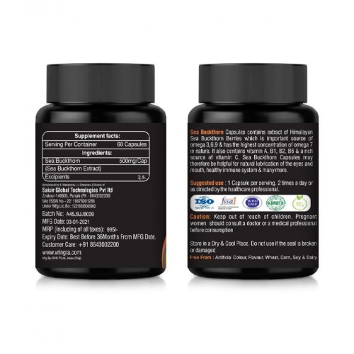 Sea Buckthorn capsules contains extract of Himalayan sea buckthorn berries which is important sources of omega 3,6,9 & has the highest concentration of omega 7 in nature. It also contains vitamins A,B1,B2,B6 & A rich source of vitamin C. Sea Buckthorn capsules may therefore be helpful for natural lubrication of the eyes and mouth healthy immune system & many more.