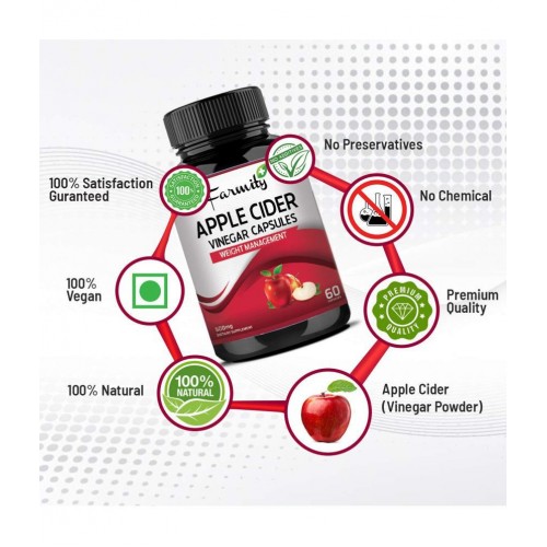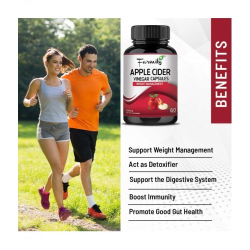 Farmity apple cider vinegar capsules are made from fermenting the sugars in apples and changing them into acetic acid. Acetic acid has a strong odour and a tangy taste. Farmity apple cider vinegar capsules have been prepared from raw, unfiltered, and unpasteurized apple cider vinegar for easy consumption. It is enriched with antioxidants, vitamins, and minerals and provides multiple health benefits. Farmity apple cider vinegar capsules may help to boost the immune system and it may cleanse the body from various negative substances. Farmity cider vinegar capsules may also be supportive in helping with the regulation of blood glucose levels. It may also be helpful in acne worries caused by bacterial growths.