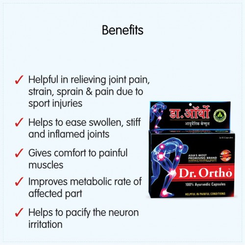 Each Dr. Ortho Ayurvedic capsules contain herbal extracts of 8 different herbs which contains medicinally important properties.Each herb has ardent anti-inflammatory properties, which helps in reducing inflammation or swelling and relieving pain. It rectifies the interrupted metabolism and accelerating metabolic rate. This aids in the elimination of the toxins which aggravates inflammation.