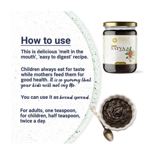 Sukrit Satva is a delicious combination of chosen ayurvedic herbs Formulated using the age-old ayurvedic recipe, Sukrit Satva works from within to strengthen the mind. The ingredients of this ayurvedic supplement are well proven nootropic, natural and safe for consumption for all age group. It is unique blend of nootropic and natural herbs – Brahmi, Shankhpushpi, Mandukparni and Shatavari. This is an Avleh (Jam like product) which can be taken as bread-spread also.