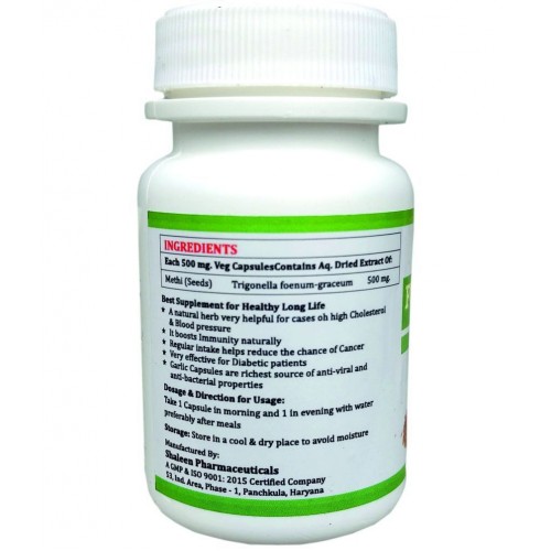 Composition: Each capsule contains 500 mg of Aqueous Dried extract of Methi (Trigonella foenum Graceum) Seeds.