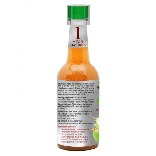 Rawmest™ 1 year matured Apple Cider Vinegar is 100% natural and is made from the delicious Himalayan apples. Our ACV is natural, filtered and fermented to 5% digestive property which may assist digestive health. Rawmest™ 1 year matured ACV may be used for overall health benefits such as weight management,