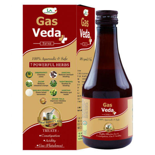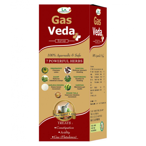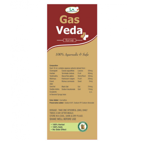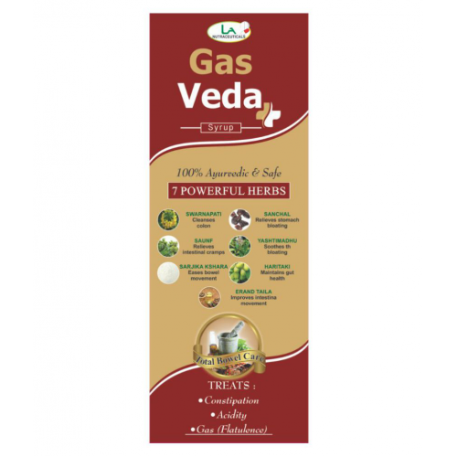 GAS VEDA For Constipation, Acidity and Flatulence. Ingredients( each 10ml ): Svarnapatri 25mg Yastimadhu 15mg Sarijka kshira 7.5mg Haritaki 45mg Erand 2.5mg Sanchal 12mg Mishreya 10mg