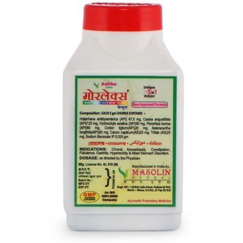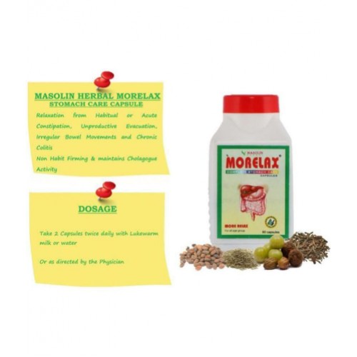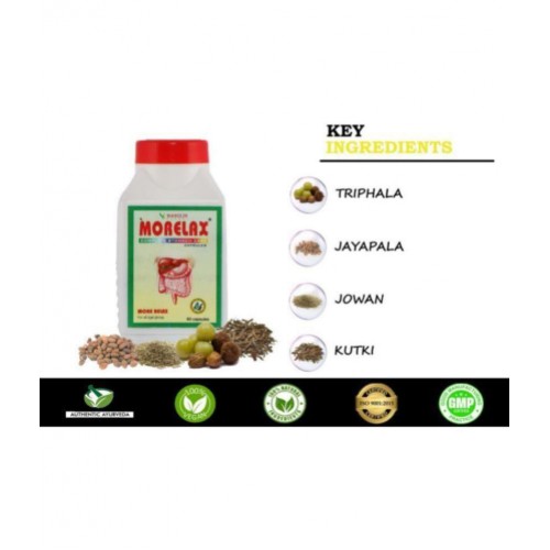 MORELAX CAPSULE consists of different herbs like Trifala, Thankuni, Kutki, Jowan, Jaiphal and other herbs which provide Relaxation from Habitual or Acute Constipation, Unproductive Evacuation, Irregular Bowel Movements and Chronic Colitis.