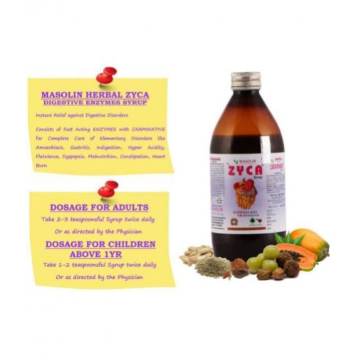 ZYCA consists of Fast Acting ENZYMES with CARMINATIVE for Complete Care of Elementary Dissorders like Amoeobiasis, Gastaritis, Indigestion, Hyper Acidity, Flatulence, Dyspepsia, Malnutrition, Constipation and Heat Burn.
