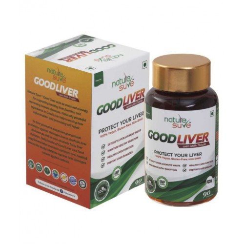 Nature Sure Good Liver Capsules are an ayurvedic proprietary formulation made from top quality herbs known to help detoxify liver and remove waste, promote healthy digestion, maintain healthy hepatic function and prevent liver against non-fatty and fatty liver diseases. The body's hepatic system is a powerful structure to detox blood, boost energy and build proteins. Daily use of Nature Sure Good Liver Capsules boosts the body's defense against free radicals and provides a powerful shield against damage to the liver and hepatic system. The natural herbs in Nature Sure Good Liver also have amazing properties to support healing of lymph, gut and gall bladder. BENEFITS: (1) Helps stimulate regular secretion of bile, keeps liver healthy; (2) Helps prevent damage due to free radicals, removes pollutants and waste from digestive tract; (3) Can protect the liver against damaging exposure from drinking, puffs and certain medications; (4) Can help in easing symptoms of enlarged liver, enlarged spleen, jaundice, discomfort in urination (dysuria) and menstrual cramps aggravated by liver problems; (5) Nature Sure offers assured quality products made with 100% pure & top-grade ingredients at GMP- & ISO-certified units approved by Directorate of AYUSH