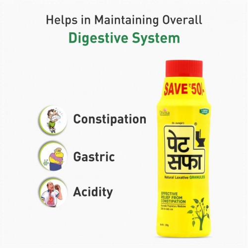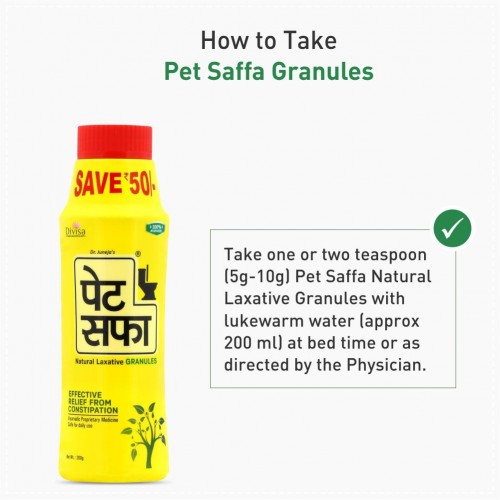A Natural Constipation Reliever : Pet Saffa Natural Laxative Granules is an Ayurvedic based formula to help in relieving from constipation, conditioned constipation by promoting digestive secretions, bulk & regular bowel formation.