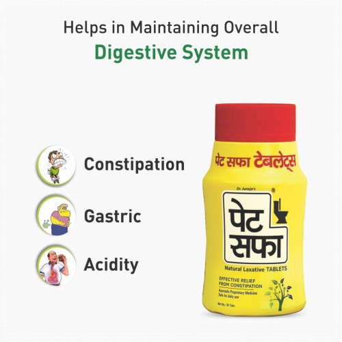 Sedentary life style, lesser bodily activity, changes in usual diet, irregular eating habits, junk food etc are the various reasons behind constipation. Pet Saffa Natural Laxative Tablet is 100 % Ayurvedic formulation that helps to relieve from chronic constipation. It is developed under stringent quality parameters with scientifically woven classical formulation helpful in maintaining regular bowel movements to ensure effective cleansing of body.