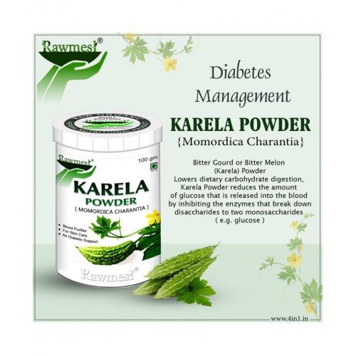 Rawmest Karela powder momordica charantia for blood purifier, for skin care, as diabetic support. Rawmest karela powder reduces the level. released into the blood stream through breakdown of carbohydrates and sugar levels. It helps in improving the digestive system by increasing the production of digestive enzymes, purifying the blood.