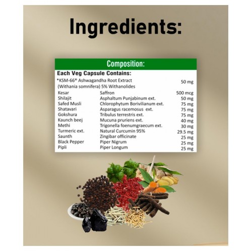 Kesar, *KSM-66® Ashwagandha Root Extract, Shilajit ext. Safed Musli ext. Shatavari ext. Gokshura etx. Kaunch beej ext. Methi ext. Turmeric Ext. Saunth Black Pepper Pipli