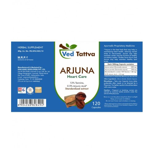 The bark of the Arjuna tree has been used for several centuries for cardiovascular related ailments. It has been known to help maintain a healthy heart & reduce the effects of stress and nervousness. It is also known to help improve the blood circulation to the heart. Ved Tattva Terminalia Arjuna contains 500mg Pure Extract and Powder. It has been formulated in Capsules form and manufactured in GMP certified facility.