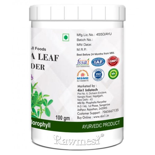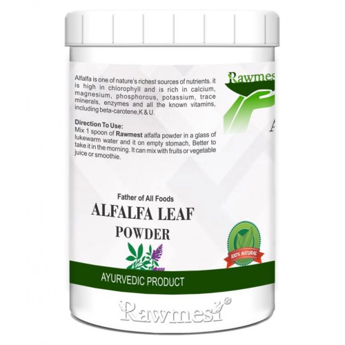 Rawmest Alfalfa Leaf Powder high in chlorophyll. Alfalfa is one of natures sauces of nutrients. It is high in chlorophyll and is rich in calcium, magnesium, phosphorous, potassium, trace minerals, enzymes and all the known vitamins, including beta-carotene, K and U.