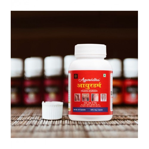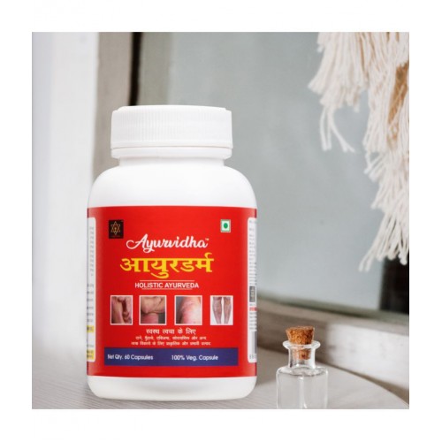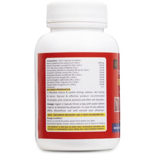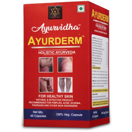AYURVIDHA AYURDERM CAPSULE is an Ayurvedic, Natural and Effective product for Psoriasis, Eczema, Pimples, Acne, fungal and other type of skin issue like itching, redness, skin scaling & lesion & for healthy skin. Ayurvedic Product for Psoriasis, Eczema, Pimples, Acne, fungal and other type of skin issues, dry, itchy skin which hydrates and repairs the skin in natural way. Used best Natural ingredients having characteristic properties like Anti-Inflammatory, Anti Septic, Anti-Microbial, Anti-Itch, Anti-Irritant & Anti-Oxidant. Product contains no added colors or preservatives, chemical & Paraben free. Ingest 2 capsule twice a day with water before meal or as directed by physician. Store in a cool & dry place away from direct sun light. Keep bottle tightly closed. Keep product out of reach of children.