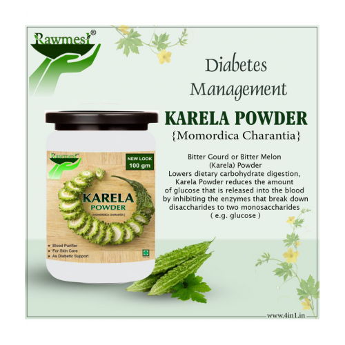 Rawmest Karela Powder An excellent source of dietary fiber, it also contains twice the calcium of spinach, beta-carotene of broccoli, and the potassium of a banana. Karela helps in preventing from the diabetes mellitus as it contains a hypoglycemic compound means plant which lowers down the blood and urine sugar level. It provides help in protecting from the diabetic complications by reducing the harmful effects of free radicals.