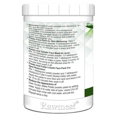 Rawmest ideal for face pack potato powder solanum tuberosum. Potato powder packed with vitamins C, B1, B3, and B6 and minerals like magnesium, potassium, and phosphorus. It contains antioxidants that protect your skin for environmental damage caused by pollution and to the sun. Hence, its no surprise that potato is super beneficial for skin.
