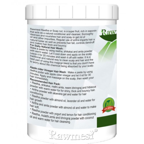Rawmest 100% pure and herbal Reetha Powder health, face, hair. Rawmest Reetha or soap nut, is a super fruit, rich in saponin that acts as a natural conditioner and cleanser, thoroughly cleanser and nourishes hair and scalp to get rid of oil and other impurities, regular use of Aritha impart hair a natural luster as well as prevents hair fall, controls dandruff and makes hair thick and bouncy.