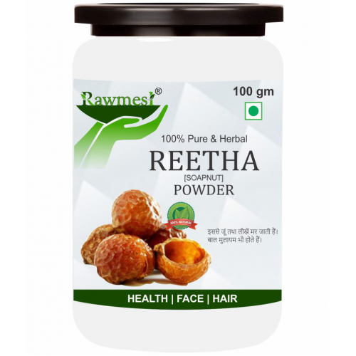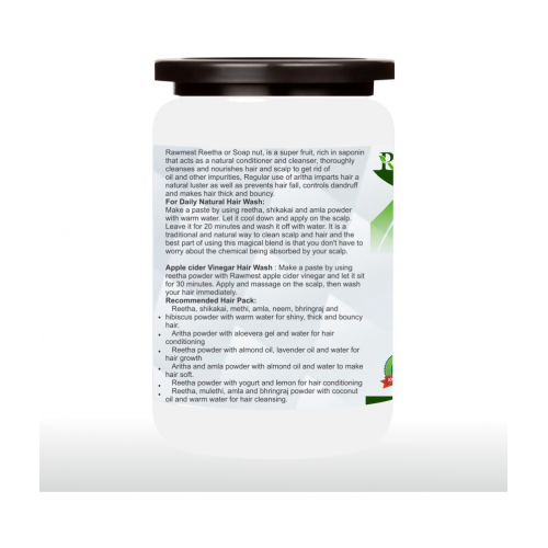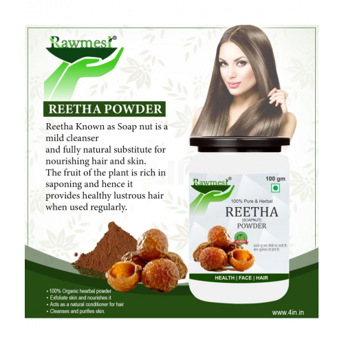 Reetha Fruit Powder is one of the most popular herbs in Ayurveda. It is all-natural, eco-friendly and economical. Vitamins D, E, and K found in this fruit are known to impart shine to hair and make it smooth. However, their benefits arenâ??t restricted to just hair. These nuts are amazing for skin as well and have multiple uses. Reetha has natural conditioning properties that help in moisturizing the skin. How to use it on Hair:-: 1. Hair Pack: - Take 3 tablespoon Rawmest Reetha Fruit Powder, 1 tablespoon lemon juice, 2 tablespoon yogurt/curd and water, blend well to form paste. Apply it on scalp and hair and let it dry. Wash it off with normal water. 2. Rawmest Reetha Fruit Powder can also be used to wash hair. Mix Reetha Fruit Powder (1 tbsp.) and Shikakai Powder (1 tbsp.) together and boil for 10-20 minutes in water. You can also use hibiscus powder in this mixture. Mash the lumps after it cools down and strain the water. Keep the water in a small bottle that can be used time to time for washing hair. Before bath, massage your scalp with this mixture. Leave it for few minutes followed by washing it off with clean water. It provides your hair a better texture and suitable shining. It makes your hair stronger and reduces the impact of hair fall. How to use it on Skin:-: Soapnut Powder can be used as face wash. Prepare a mix of Rawmest Reetha Fruit Powder and essential oil (few drops). Stir it properly and apply the mixture on face instead of using face wash. Regular use of this, gives you a dazzling face.