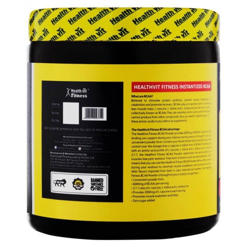 "Healthvit Fitness BCAA Powder provides 6000mg of BCAAs in each serving; lending you support during your intense training sessions. Brought to you in a convenient powder form, it enters your blood stream faster and gives you more control over the dosage than a capsule or tablet form of BCAA. Providing you with an amino-acid profile of L-Leucine, L-Valine and L-Isoleucine in a ratio of 2:1:1, the Healthvit Fitness BCAA Powder replenishes the amino-acids your muscles lose post-workout. Added benefit of Citrulline Malate & L-Glutamine to boost your workout. Healthvit Fitness BCAA can be take pre & post workout. • INSTANT MUSCLE RECOVERY . • REDUCED MUSCLE FATIGUE. • PREVENTS MUSCLE LOSS ."