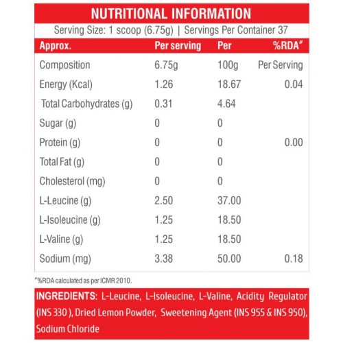 Citrus Mojito: Branch Chain Amino Acids Powder (L-Leucine, L-Valine), Acidity Regulator (INS 330), Dried Lemon Powder, Sweetening Agent (INS 955 & INS 950)