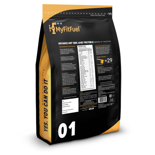 Advance MFF 100% Whey Protein ™ Advance MFF 100% Whey Protein™ is a researched product with greater understanding of Protein ratios providing more whey protein isolate. Being advance source of protein with added Digezyme® and 22 Vitamins and Minerals it helps to reduce muscle breakdown, encourages muscle growth & repair helping to build muscles more effectively. If you goal is to build stronger muscles, sports performance or even general health & fitness, it’s the best source of protein.Key Features. • More Whey Protein Isolate 90%. Unique 25:75 Ratio Blend of Whey Isolate and Whey Concentrate. • Provides 28.5gm “Dry Basis” Protein and 26.5gm “As is” Basis” Protein in Vanilla Crème Flavor. • Provides 26.5gm “Dry Basis” Protein and 24.8gm “As is” Basis” Protein in Chocolate Fudge Flavor.• MyFitFuel trusted by 50,000+ happy customers. • Added Digezyme® latest Digestive Enzymes Technology. They are unique researched combination of Gluten Free & GMO Free Multi Enzyme Blend including amylase, lactase, cellulase, lipase & protease. • Added 22 Vitamins & Minerals for better growth & overall nourishment of body. Ratio of vitamins & minerals used are determined keeping into mind special consideration of improving your workout & recovery. • Provides naturally occurring upto 5.9 gm BCAA & 4.4 gm Glutamine rich, 12 gm Essential Amino acids.• Ultra Low in carbohydrate & fat. Ultra-pure Lab tested protein & ideal for lean growth. • 100% transparency, you can check Protein Report about which protein used in the product page on MyFitFuel website.• You can authenticate Product through given scratch code on product.• Highly Soluble Protein giving you a very smooth textured & tempting flavored protein shake.• No Protein spiking. We disclose protein in every product variant Other Features.• No Skim Milk Powder No Dairy Whiteners, No Soy Protein, No Color, No Sugar, No Artificial Flavor or Preservatives added. • Added Digezyme® latest Digestive Enzymes not only helps in better digestion and removes the bloated feeling but also helps in making sure that the overall protein content and other nutrients gets absorbed more quickly so as to get quick benefits and better recovery.• In added 22 Vitamins and Minerals, Vitamin B helps in providing energy from carbohydrate. Vitamins C helps to maintain strong immunity & formation of hemoglobin to transfer oxygen to muscles. Vitamin D for calcium absorption and to minimize stress fractures. Many other important benefits for better fitness.• First in India in year 2013 to bring knowledge on 100% Transparency including information on cheap fillers, thickeners and now in year 2017 we are first in India to bring better education on knowledge of “Dry basis” Protein vs “As is basis” protein. You can read complete details on Product Page on MyFitFuel website. Other Daily Value Features.Direction of use:Add 200-250ml of water in any shaker like MyFitFuel MFF™ Classic Shaker and add 1 scoop of Advance MFF 100% Whey Protein™. Shake it for 15-20 seconds & consume immediately. To make thick shake use less water. We recommend 2-5 servings daily depending on your goals and intensity of workout. Usage:Some train in evening and some in morning but we recommend following important serving times. • Immediately upon walking up. • 30-45 minutes pre workout • Immediately after you work out.• Any other time during the day or in between meals when you require additional protein intake. INGREDIENTS – Vanilla Crème FlavorWhey Protein Concentrate, Whey Protein Isolate, Natural Identical Flavors, Vitamins Blend , Sucralose (INS 955), Minerals Blend, DigeZyme®.INDICATIONS:Benefits of taking with Water- Helps to get Lean Muscles & reduces the overall calorie. Recommended to any individual following the weight loss plan or restricted calories intake. Benefits of taking with milk- Make the shake creamier & thicker. But, 250 ml of toned milk will also add almost 150 extra calories. Recommended to any individual looking to bulk up or to increase weight