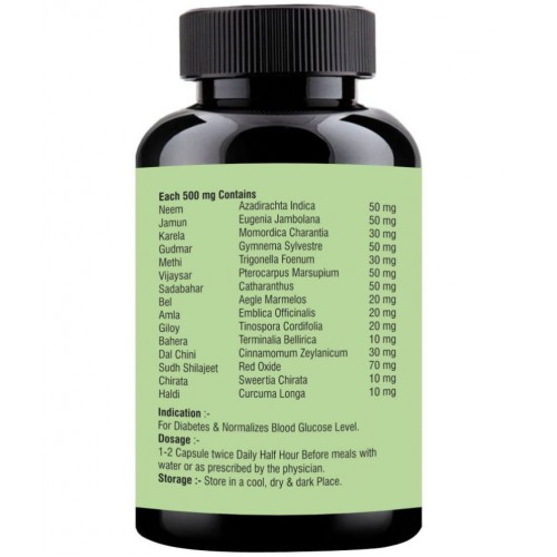 Diaba Care Capsules Is an ayurvedic super-strong formula that supports blood sugar control. Each tablet contains Amla, Karela, Giloy, Jamun, and sudh-Shilajit, which have been proven to be effective in controlling blood sugar levels. This product does not contain any chemical or synthetic ingredients. For best results, use 2 Capsule Twice a day Half Hour Before Meals With Water Or As Prescribed By the Physician for at least 3 months at the correct dose depending on the severity of your condition.