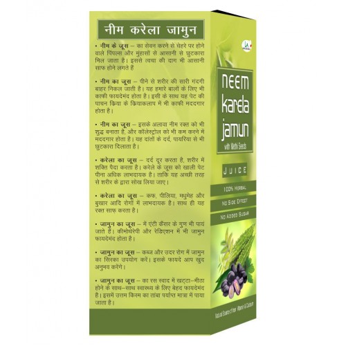 LOADED WITH VITAMINS & NUTRIENTS: Karela is a health-friendly vegetable with endless benefits if added to the regular diet, it's fully loaded with a range of powerful nutrients-iron, VitaminC, magnesium, potassium etc.& wonderful source of dietary fiber that contains almost twice the calcium of spinach.Kala Jamun has astringent property that flushes toxins, rejuvenates skin,helps increase iron in body.Desi Neem is enriched with abundant antifungal,antidiabetic,antibacterial,antiviral,contraceptive properties.