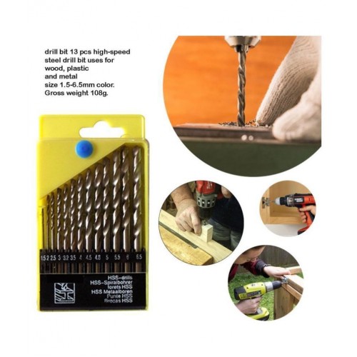Drill Bit Set (13 Pieces) Industrial quality for smooth accurate drilling Use on plastic, metal and wood coated HSS drill set with standard 1/4" hex shank that will fit cordless screwdrivers, drills etc or use in standard drill chuck. Fitted with 1/4" hex shank. Material: Steel Sizes: 1.5 - 6.5mm. Sizes included are: 1.5mm, 2mm, 2.5mm, 3mm, 3.2mm, 3.5mm, 4mm, 4.5mm, 4.8mm, 5mm, 5.5mm, 6mm, 6.5mm. Quantity: 1 set(13pcs) Package includes: 1 x 1.5mm HSS Drilling Bit 1 x 2.0mm HSS Drilling Bit 1 x 2.5mm HSS Drilling Bit 1 x 3.0mm HSS Drilling Bit 1 x 3.2mm HSS Drilling Bit 1 x 3.5mm HSS Drilling Bit 1 x 4.0mm HSS Drilling Bit 1 x 4.5mm HSS Drilling Bit 1 x 4.8mm HSS Drilling Bit 1 x 5.0mm HSS Drilling Bit 1 x 5.5mm HSS Drilling Bit 1 x 6.0mm HSS Drilling Bit 1 x 6.5mm HSS Drilling Bit