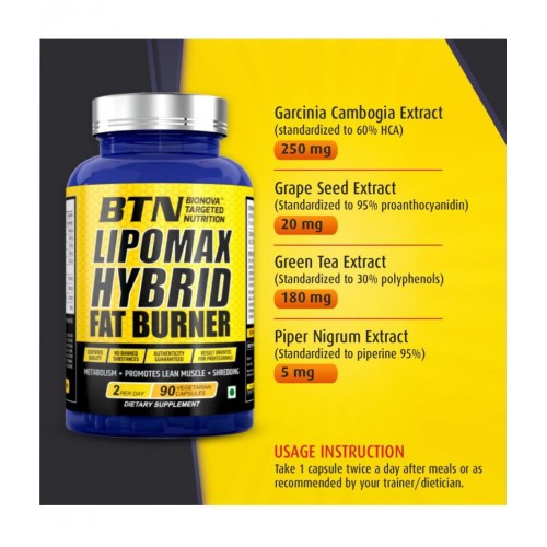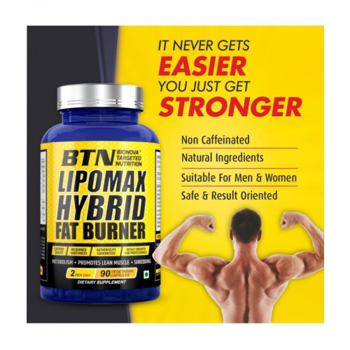BTN LIPOMAX HYBRID FAT BURNER is non-caffeine formula to release stored fat and help you burn fat at an extremely high rate. A distinctive combination of natural ingredients like Garcinia cambogia, Green Tea, Grape Seed & Piper nigrum helps to maximise lipid degradation, energy & restrict unhealthy food cravings. BTN LIPOMAX HYBRID FAT BURNER is perfect for athletes, men and women, who are looking for extremen fat loss. Along with a regular workout & disciplined diet BTN LIPOMAX HYBRID FAT BURNER worsk to stimulate thermogenic fat burn, aetabolise and mobilise fat, elimination of water to give you a lean muscle & dream body