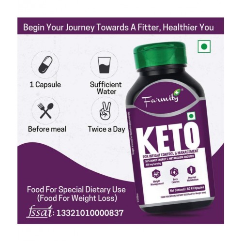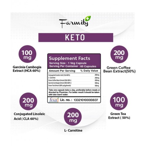 Farmity Keto Capsules are a powerful supplement prepared from the synergistic power of natural components like Garcinia Cambogia, Green tea, Green coffee beans, L- Carnitine, MCT powder, Linoleic acid and Tri-low. These capsules are a blend of natural components, enriched with several nutrients and antioxidants which make it an easy way to manage weight issues and improve the overall health. Keto supplement may help you feel full for a longer duration and you may not feel hungry. It contains herbal ingredients which may help in effectively replenishing energy stores across the body to enhance the rate of metabolism of the body and helps in managing weight issues in men and women.