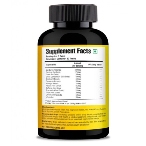 Floral Nutrition Fat Burner Advanced Weight Loss Tablet – a powerful dietary supplement that pushes the body in a state of ketosis, helpful to burn extra body and belly fat naturally. FN-Fat Burner Tablet for weight loss are enriched with the synergistic power of 14 natural ingredients like Caramulla Fimbriata, Green Tea & Coffee Beans, Garcinia Cambogia, Moringa Oleifera, Papaya Fruit extract, Bromelain and Grape fruit Extraxt – all known to minimize excess Body’s Fat storage. But how it works? The ketosis state achieved as a result of consuming Garcinia Cambogia and Green Coffee lowers down blood ATP levels and substitute fat for the same, meaning the body starts using fats to generate energy and perform other Vital Body functions. A toned, active, and energetic body! What’s more? The consumers who use FN- FAT BURNER Advanced in their routine daily life have reportedly witnessed less frequent food Cravings, better Nutrient absorption, and more energy. So, for best results, Take 1 FN-Fat Burner Tablet 30 minutes before meals 2 time daily with lukewarm water and do not forget take your Breakfast and Lunch after taking FN Fat Burner or as directed by a dietitian.