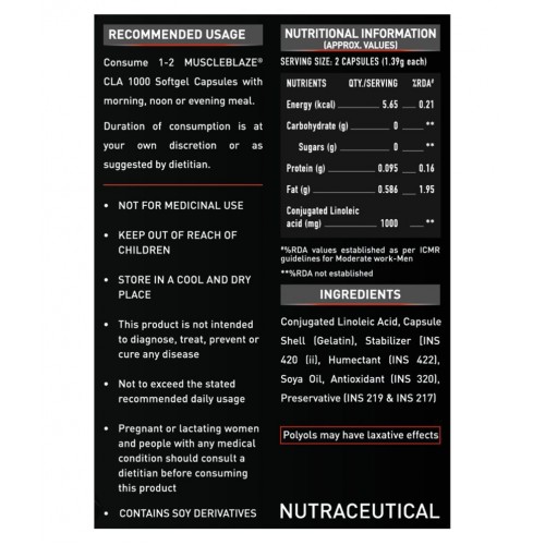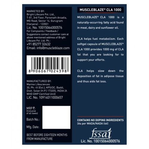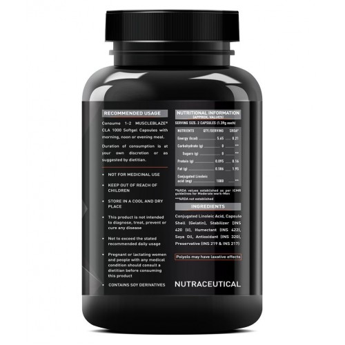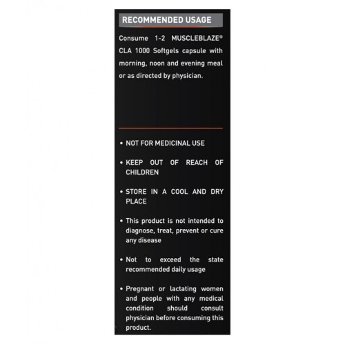 CLA, Conjugated Linoleic is naturally occurring fatty found in meat and dairy products. It is a blend of various linoleic those together make CLA. It enhances body’s metabolism to eliminate assimilated and unwanted fats from the body and promotes good cholesterol. Due to reduction of unwanted fats from the body, the growth of lean muscle mass can be seen within days of using MuscleBlaze® CLA 1000. It also helps to remove harmful toxins and free radicals from the body. CLA 1000 is a very beneficial supplement for fitness admirers who are trying to lose excess fats and gain lean muscles. With optimum nutrition and healthy eating habits, CLA 1000 by MuscleBlaze® is a must to see better results and energize the body.