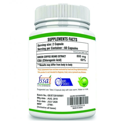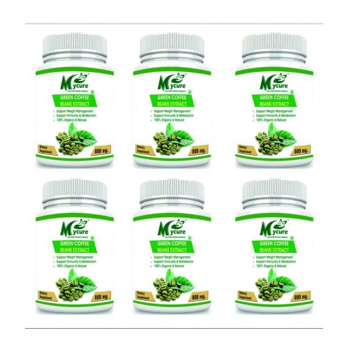 Mycure Green coffee extract (50% chlorogenic acid )vegetarian capsule As green coffee beans are not roasted these Green coffee extract contain a higher amount of the chemical chlorogenic acid . This chemical is thought to have benefits for high blood pressure it might affect blood vessels so that blood pressure is reduced for weight loss.