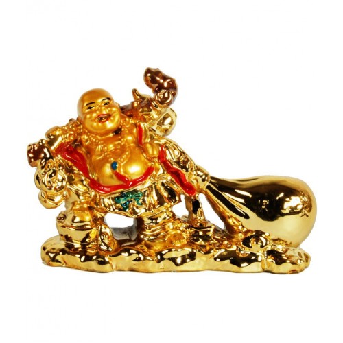 The statue of a Happy Buddha sitting on a Dragon Turtle signifies happiness, good luck and fortune. The Dragon Turtle sitting on a bed of coins and gold ingots is a distinct representation of wealth and prosperity. The Dragon Turtle is a Chinese legendary symbol depicting the dragon’s head and the turtle’s body. The dragon represents courage and strength. The turtle stands for support and stability. This powerful combination of two Feng Shui symbols brings together the qualities of the dragon and the turtle, which indicates long life, permanence and success. The Happy Buddha on a Dragon Turtle is known to be a perfect remedy to combat bad luck which comes in the form of illness, financial losses, and mishaps.