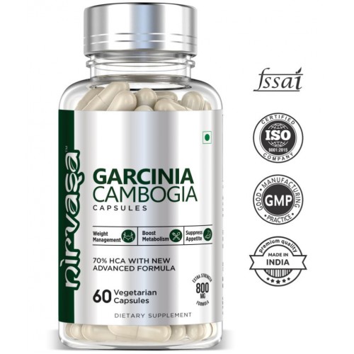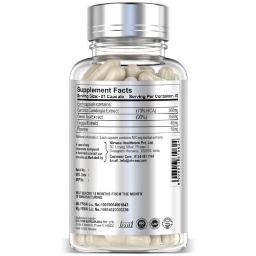 Nirvasa Garcinia Cambogia Capsules feature a strong composition of three powerful ingredients – Garcinia Cambogia Extract (500 mg), Green Tea Extract (250 mg), and Guggul Extract (50 mg). Garcinia Cambogia is a citrus fruit commonly grown in Asian countries. Its rind contains hydroxycitric acid (HCA) which is linked to potent weight management properties. Their regular consumption helps the body block the action of citrate lyase, an enzyme that converts body sugars into fat, contributing to lower fat accumulation in the body. It is true that there is no magical path to maintain desired body weight. Either it takes a healthy diet paired with a rigorous workout regime or disciplined adherence to a natural fix for weight management. So, if you don’t wish to toil hard in the gym or follow a diet full of foods (that you don’t like eating), resort to Garcinia Cambogia capsules. Apart from weight management, this Garcinia Cambogia supplement can help boosting your digestive health, reducing bad cholesterol, enhance energy, and detoxify the body. So, gradually you may slip into a lighter version of your body and experience better energy levels. For best results, take 1 capsule twice daily at least 15-20 minutes before meals with lukewarm water or as advised by your dietitian.