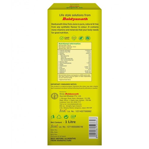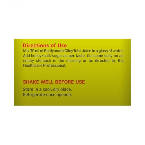 Baidyanath Giloy Tulsi Juice is extracted from fresh Tulsi leaves and Giloy stems. These two herbs individually have great health benefits, and together, they become more effective in boosting your immunity levels. Tulsi and Giloy are popular and useful Ayurvedic herbs. They have been used in ancient Ayurvedic medicines to combat common infections and allergies. Giloy is well known due to anti-inflammatory property, so helps in combat with body pain, joint ache. Whereas Tulsi is helpful in building a strong immune and respiratory system. The holy basil ( Tulsi) is used in herbal remedies for a lot of common ailments, like cold and cough, helpful to handle life’s daily stress and anxiety, boosts stamina, relieve inflammation, flush out toxins, improve digestion and provide a rich supply of antioxidants and other nutrients to the body
