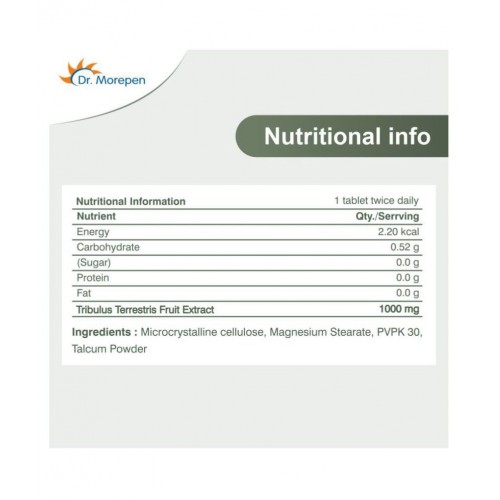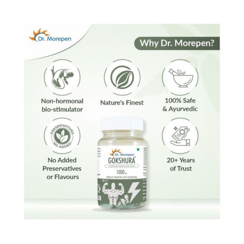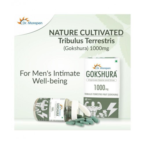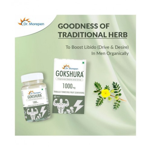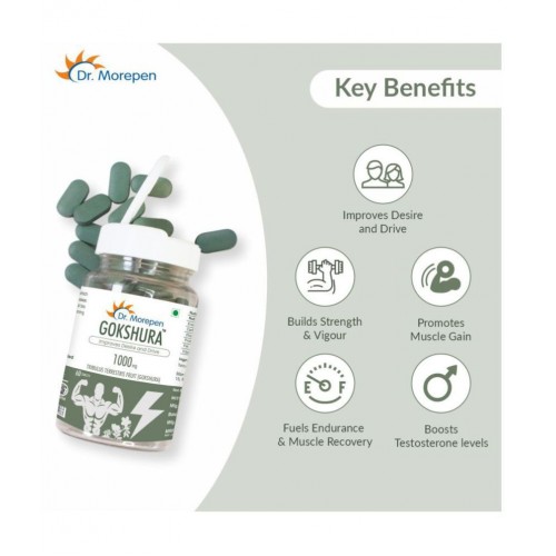 • INCREASES DESIRE – The herb enhances desire and drive in men through Ayurveda’s power to keep them aroused and last longer in bed. It works great for issues relating to health leading to intimate inefficiency. • IMPROVES PERFORMANCE – Dr. Morepen Gokshura Tablets help in maintaining a sound health and improves performance in men naturally by promoting endurance & increased drive. • BOOSTS STAMINA – It helps in boosting stamina and energy naturally & can benefit in bodybuilding and overall fitness routine by toning muscles. Also, helps improve athletic performance. • FIGHTS SKIN PROBLEMS – Gokshura, being a natural anti-oxidant & cleanser is effective in keeping skin issues like – acne, pimples, fine lines, wrinkles, dark circles, spots etc. at bay. • SOUND KIDNEY & URINARY SYSTEM – It helps reduce the risk of kidney stones due to its mutral (diuretic) property which increases the urine output and helps flush the toxins from the urinary tract and kidneys. • INCREASED BLOOD FLOW – Consumption of Gokshura helps in relaxing the blood vessels thus making it easier for the blood to flow through overall body and heart smoothly. • TRUST & QUALITY – Dr. Morepen ensures the highest quality formulation with rigorous checks & testing. We bring the Trust and Credibility of more than 20 Years to give you the best of Nature backed by Science.
