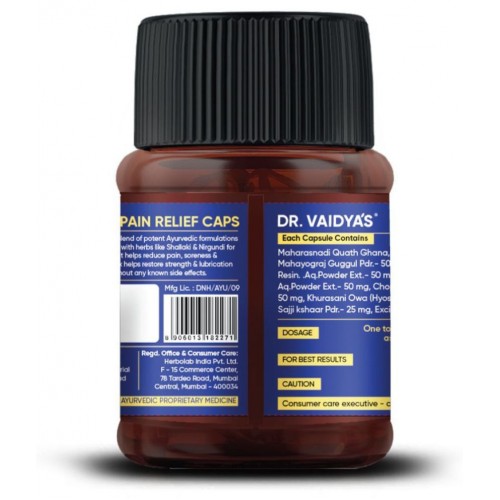 Dr. Vaidya’s Pain Relief Capsules is a specially formulated Ayurvedic medicine that helps bring relief from joint and muscle pain. The ingredients include Chopchini and Kursani Owa, known for their anti-inflammatory properties which are beneficial in Rheumatoid arthritis and gout.