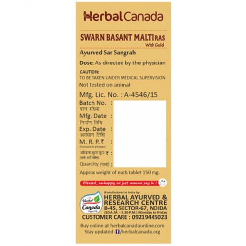 Harc Herbal Canada Swarn Basantmalti Ras Tablet 25 No's pack of 1|100% Natural Products