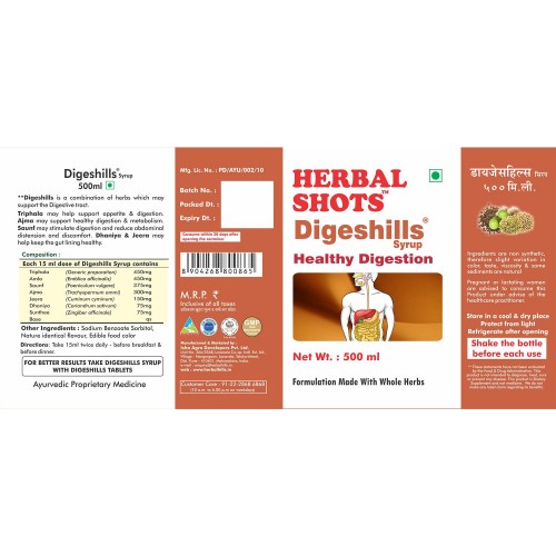 Herbal ingredients present in Digeshills Liquid extract herbal shots provides quick relief from the symptoms such as flatulence (gas), abdominal distention, heartburn, thereby improving the digestive function. Digeshills sugar free liquid protects mucosa from ulceration . Digeshills can be given as as adjuvent to anti-inflammatory. Digeshills gives relief from the burning pain. It relieves the symptoms of indigestion and thus improves appetite
