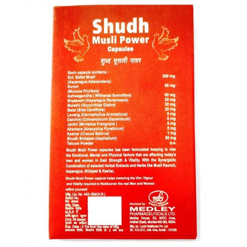 A Herbal Rejuvenation Thearapy for Men and Women - Ayurvedic product Each Capsules Contains Ext.Safed Musli 200 mg,Kunch 50 mg,Ashwagandha 50 mg,Shatawari 20 mg,Mulethi 30 mg,Balal 20 mg,Lavang 5 mg,Dalchini 5 mg,Javitri 5 mg,Akarkara 5 mg,Keshar 1 mg,Shudh Shilajeet 50 mg.