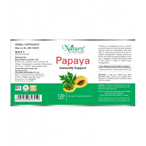 Naturz Ayurvedas Papaya is considered to be a natural source of essential vitamins, hence a natural source of antioxidants that may help in improving immunity and aids in weight management. It is rich in carotenes & flavonoids which is highly recommended for its medicinal value. Papaya leaves are known to contain an enzyme Papain which aids in digestion.Traditionally Papaya leaf is also known to help in blood sugar management.