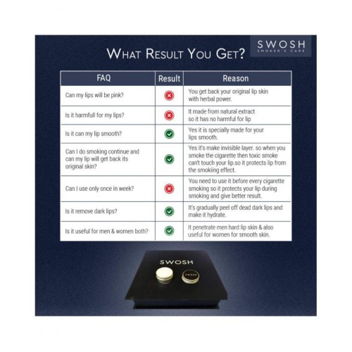 Clove, Mint, Frutta is World First Fusion Ball Technology in Herbal Stick, It helps in craving symptom and helps to quit. Swosh Protect Lip From Toxic Smoke of Stick And Effectively protects lips in all weather conditions. Creates a protective layer on the lips (applied before Smoke) Natural flavor - Neutral, delicate taste provides a perfect experience, Pleasant and durable smell. No bad breath. Non addictive - Contains no addictive substance.