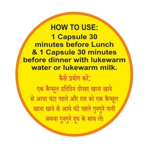 कैसे प्रयोग करें: एक कैप्सूल प्रतिदिन दोपहर खाना खाने से आधा घंटा पहले और एक कैप्सूल रात को खाना खाने से आधे घंटे पहले गुनगुने पानी अथवा गुनगुने दूध के साथ लें।