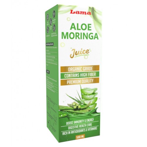 Lama Aloe Moringa juice infused with the goodness of moringa and aloe vera. The hydrating formula cleanses the skin, making it soft and smooth. While moringa oil absorbs dirt and oil, aloe vera contains essential nutrients that protect the skin.