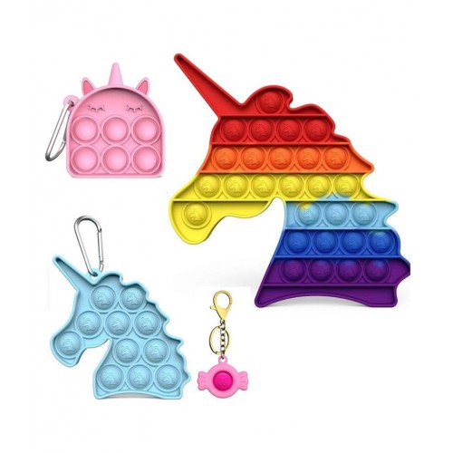 FLICK IN presents set of 4 push pop it bubble fidget toy in unicorn & keychain shape. This is pop fidget toy rubber is an absolutely safe toy for your child to develop, push pop sensory toy helps in a stressful situation and also helps you distract your child while you are doing household chores. Also great for anxiety & stress relief. This Fidget sensory toy can effectively help to relieve stress and anxiety, restore the mood. It is a stress popper toy and helps to restore your mood. It is for all ages. A good on-the-go toy in a car, plane, school, office, restaurant, camping, travel. Easy to be cleaned. A great gift for birthday, christmas, thanksgiving, halloween, parties, carnival parties, garden parties, etc. They are ideal for people of all ages. The anxiety relief toys for teens for school can be served as fidget toys due to its super flexibility. Soft and comfy to touch. It’ s a great sensory fidget push toy for the elderly, adults and children who need to relieve stress. It will effectively help to relieve anxiety and stress, restore the mood. “Pop, Pop, Pop” sounds very enjoyable and decompressed.