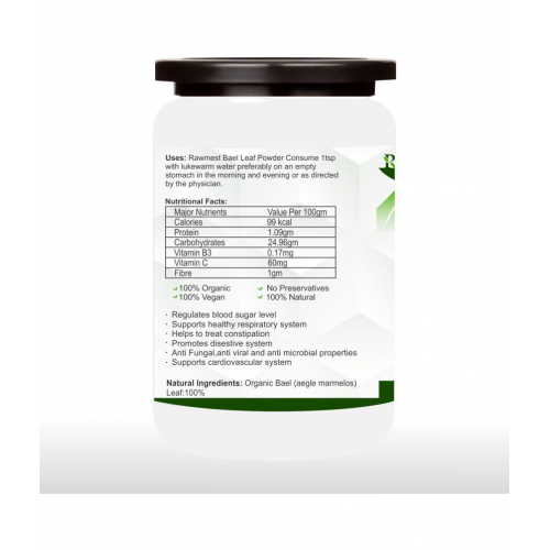 Rawmest The bael Patra Leaf Powder. bael tree is considered to be sacred to the hindus. A famous drink known as sherbet is made from the bael leaves powder Bael churna contains laxative properties that help to treat constipation. It is helpful in treating dysentery, diarrhea, IBS, IBD, Ulcerative colitis and all other gastrointestinal problems. Bael Leaves (Belgiri) Powder can help to cure diarrhea, hemorrhoids, vitiligo. Bael Leaf Powder helps reduces gastric ulcer. Bael Leaf Powder contains Antimicrobial property. Bael Leaf Powder can help to cure scurvy. For effective result, Consume 2-5gm twice a day with water. Rawmest Bael leaves are rich in vitamins B1, B2, C, and minerals like calcium, potassium, and iron. There are many health benefits of bael leaves, it can treat tuberculosis, ulcer, and digestive problems. Beal leaves are also a good source of tannins which can help in treating.
