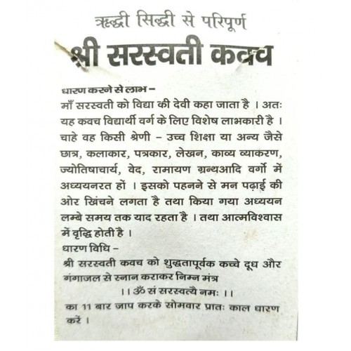BEST Buy Sidh Shri Alokik Divya Saraswati Kavach Pendent Locket Rudraksha Puja ArticleThis yantra ensures success in studies and high achievement in competitive examinations. It is a known remedy for mental disorders, weak intellectual growth and lunacy. This yantra ensures success in studies and high achievement in competitive examinations. .It is a known remedy for mental disorders, weak intellectual growth and lunacy. Importance the red string? This particular colour of string is used in Kabbalah (Madonna, anyone?), Hinduism and with the Chinese. Kabbalists believe that red string wards off the evil eye and offers up protection..Hindu priests use red string, or kalava, after yajnas, prayers or pujas, the knots tied while reciting sacred mantras or chants. My husband and I have worn these until they naturally fall off (we're supposed to dispose of them in the ocean...). In Buddhism, red string signifies a blessing. Much like the kalava in Hinduism, the buddhist lama blows the power of his mantra into the 'protection and blessing cord' as he ties the knots.
