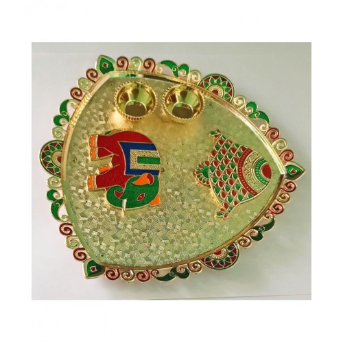 ARYCLIC DECORATIVE POOJA PLATE WITH TWO STANDS FOR CUMCUM AND CHAWAL, SHINY & SUPERIOR DESIGNED INCREDIBLE APPEAL GOLDEN COLOUR PLATTER FOR ALL FESTIVALS -- 1 PIECE GOLDEN