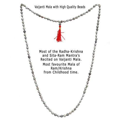 This mala is known as the "mala of victory" and is used to phone upon ram and krishna to dispell untruth and injustice. Vaijanti seeds come from a tall grass and it's seeds have a polished finish and a natural hole through the center. Vaijanti are unique white bead seeds found only in the braj forests around mathura (the land of krishna) where the god and goddess eternally make love.. Vaijanti beads are believed to be a favorite of lord krishna. They are slightly elongated, shaped more or less like tear drops. They feel tremendously soothing to turn while japa and also very attractive to wear. Vaijanti is also used for vashikaran, attraction & siddhi. It is a mala of victory. Vaijanti mala is lord vishnu's garland. It is very common belief among the people that bearer of vaijanti mala never looses anything in life. Used for jaap of lord krishna, vishnu and rama.One who wears vaijanti mala can't be harmed by any magic or tantra attack. Vaijanti means that which brings victory. Vaijanti are for removing the malefic effects of the planet saturn. Vaijanti mala usually sometimes have cracks in some beads because of it's fragile nature but that does not have any negative impact. Suggested mantras for this mala: om sri rama jaya rama om sri krishma sharanam namah om namo bhagavate vasudevaya" blessed and energized with proper mantras, puja's and spiritually activated by swami budhiraja to give best results. Since a yantra and mala is a man-made object, it requires energization to infuse potency and power to benefit the owner. Before sending the yantras or malas, we get pran pratishtha (energization) done by learned pandits (priests). This is done by reciting mantras as prescribed by vedas (hindu holy books), as well as homa for the respective devi/devta (god/godess) as per purpose of yantra and mala.Water from river ganga (ganges) is used for the energization purpose.