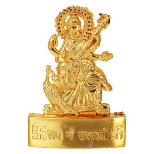 Golden plated goddess saraswati idol : saraswati is worshipped as a deity of knowledge. The benediction of shri saraswati devi helps in achieving extraordinary intellect. Idol of maa saraswati looks very beautiful. It can also be a unique and valuable gift to your loved ones. You can add this wonderful idol of maa saraswati, and can be placed and worshipped in puja room. Its look excellent in your home or office.Disclaimer: • product colour may slightly vary due to photographic lighting sources or your monitor settings. Descriptions for products are taken from scripture, written and oral tradition. Products are not intended to diagnose, treat, cure, or prevent any disease or condition. We make no claim of supernatural effects.Note: the image has been enlarged for better viewing • keep it away from perfume, sprays and water.